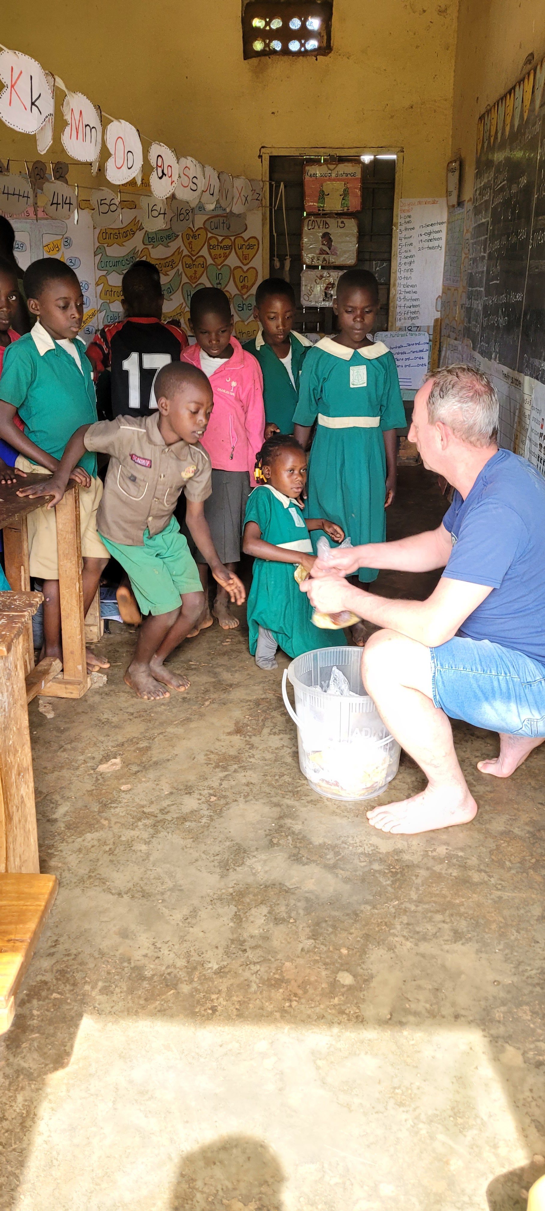 Uganda Reise 2023 27/04/2023Allgemeinadmin 38_Brotzeit-wird-verteilt-in-der-Primary Bild 65 von 81 Prayer am Abend in der Secondary School Ausblasen des Tiefbrunnens