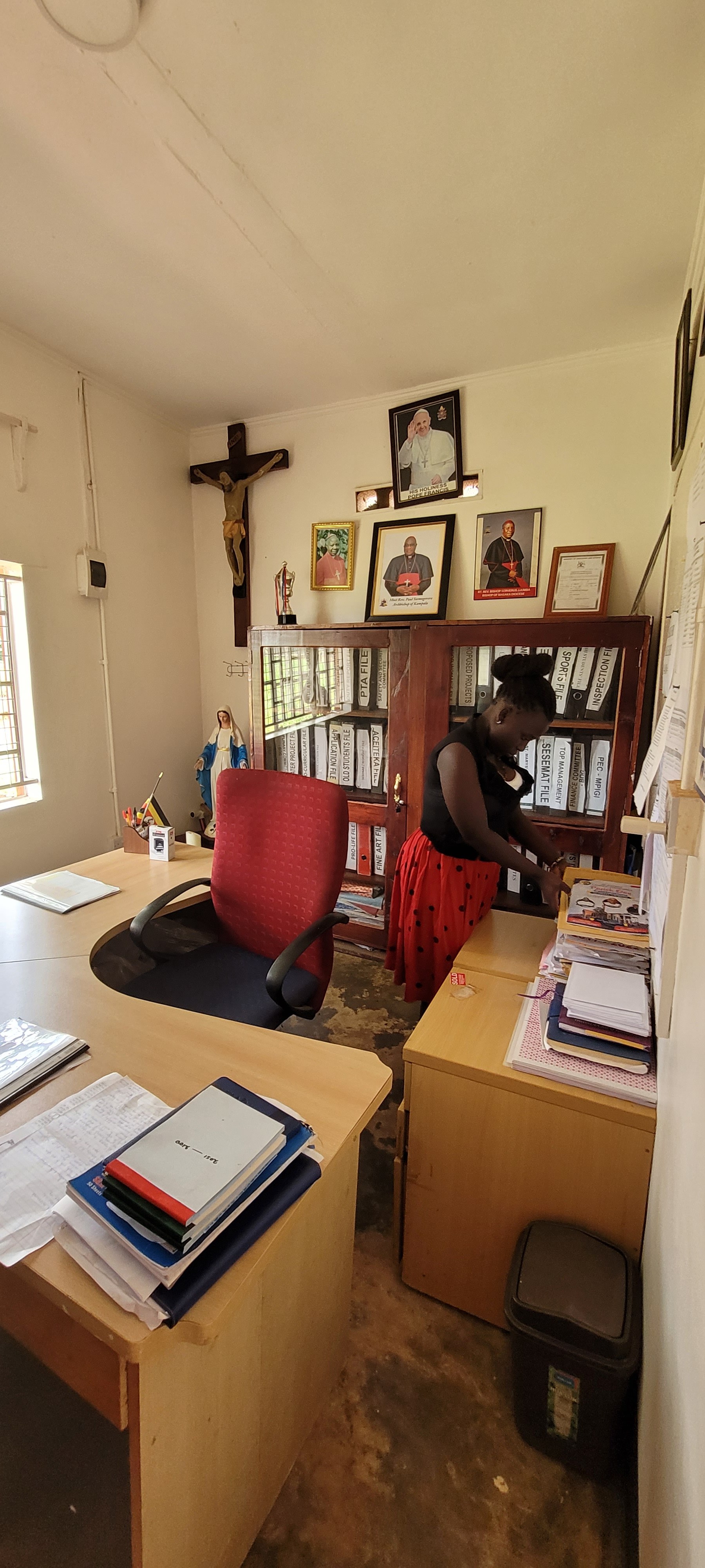 Uganda Reise 2023 27/04/2023Allgemeinadmin 41_Kleines-Buero-von-HM Bild 70 von 81 Prayer am Abend in der Secondary School Ausblasen des Tiefbrunnens