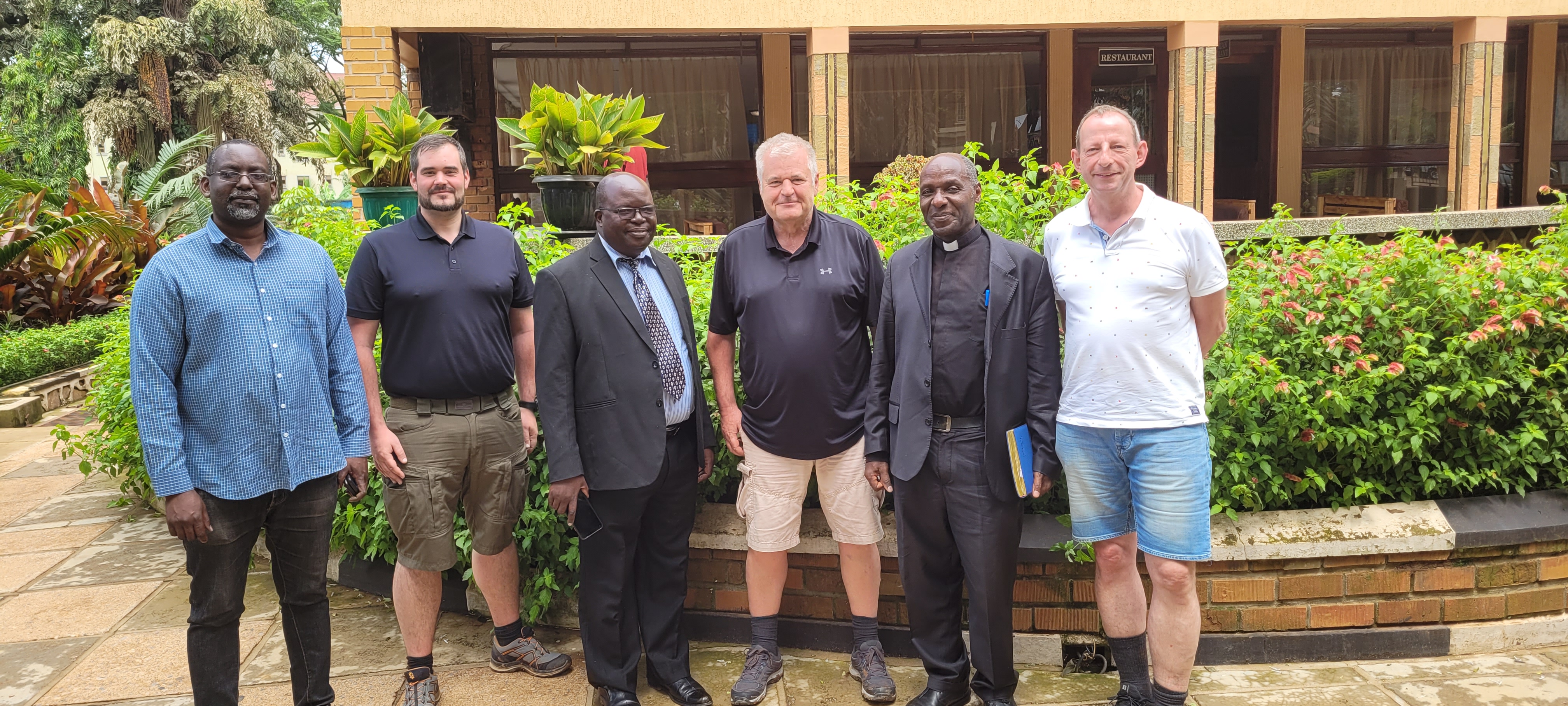 Uganda Reise 2023 27/04/2023Allgemeinadmin 45_Meeting-mit-Rev.-Fr.-John-Bosco-Ssettumba-2.-v.-re Bild 74 von 81 Prayer am Abend in der Secondary School Ausblasen des Tiefbrunnens